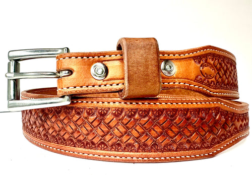 Our belts are sized measuring from the inside of the buckle to the middle hole.